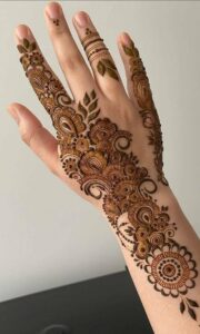 A full hand Mehndi design encompasses the entire front and back of the hand, including fingers and wrists. These designs are typically elaborate and detailed, often requiring hours of precise artistry. Popular in bridal looks and festive occasions, they combine various elements like paisleys, florals, peacocks, mandalas, and geometric lines to form a visually stunning masterpiece.