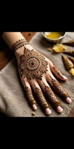 Geometric mehndi often incorporates negative space effectively, allowing the skin to become part of the design. This approach creates modern, sophisticated looks that photograph beautifully and complement contemporary fashion.